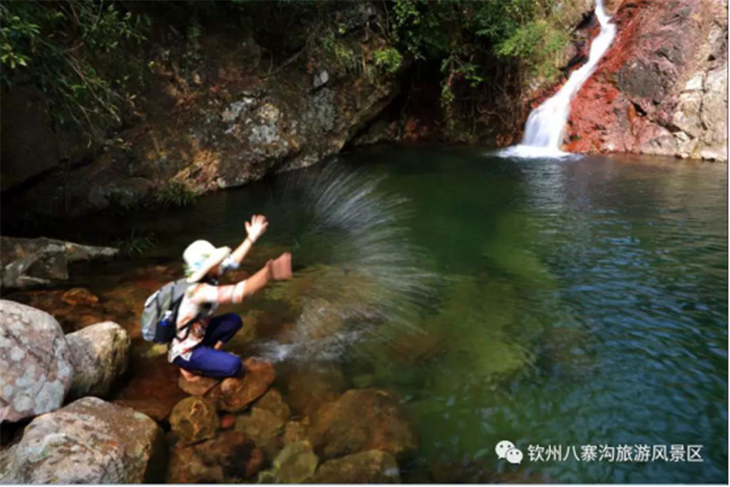 欽州的八寨溝與四川的九寨溝一樣,都具有豐饒的水源,異常清澈,天然原生態(tài),均為未遭到現(xiàn)代文明入侵和污染的圣潔凈土。也許是八寨溝的水都發(fā)自十萬大山的深處吧,匯聚著眾多的山泉沿著溝壑奔騰而下,一路隨心翻浪,一路高亢歡歌,從而在長年的沖擊中形成了大大小小的泉潭,并且順著山勢形成了不少或大或小的瀑布。