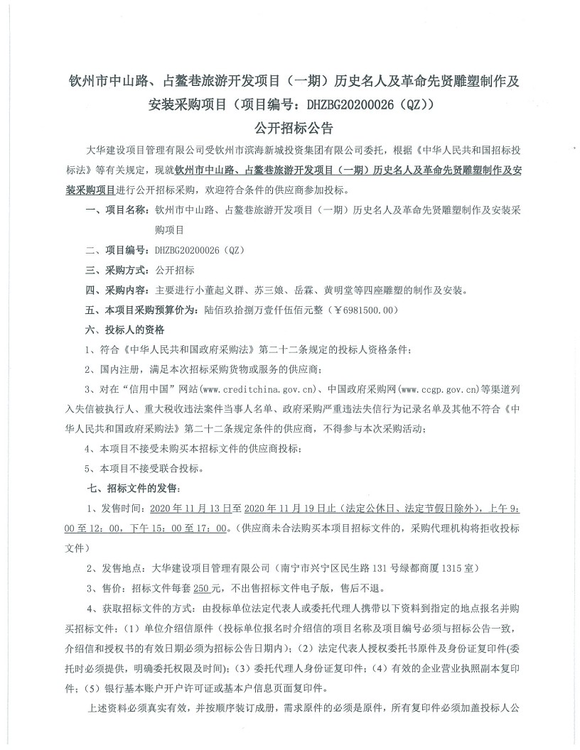 欽州市中山路、占鰲巷旅游開發(fā)項(xiàng)目(一期)歷史名人及革命先賢雕塑制作及安裝采購(gòu)項(xiàng)目公開招標(biāo)公告
