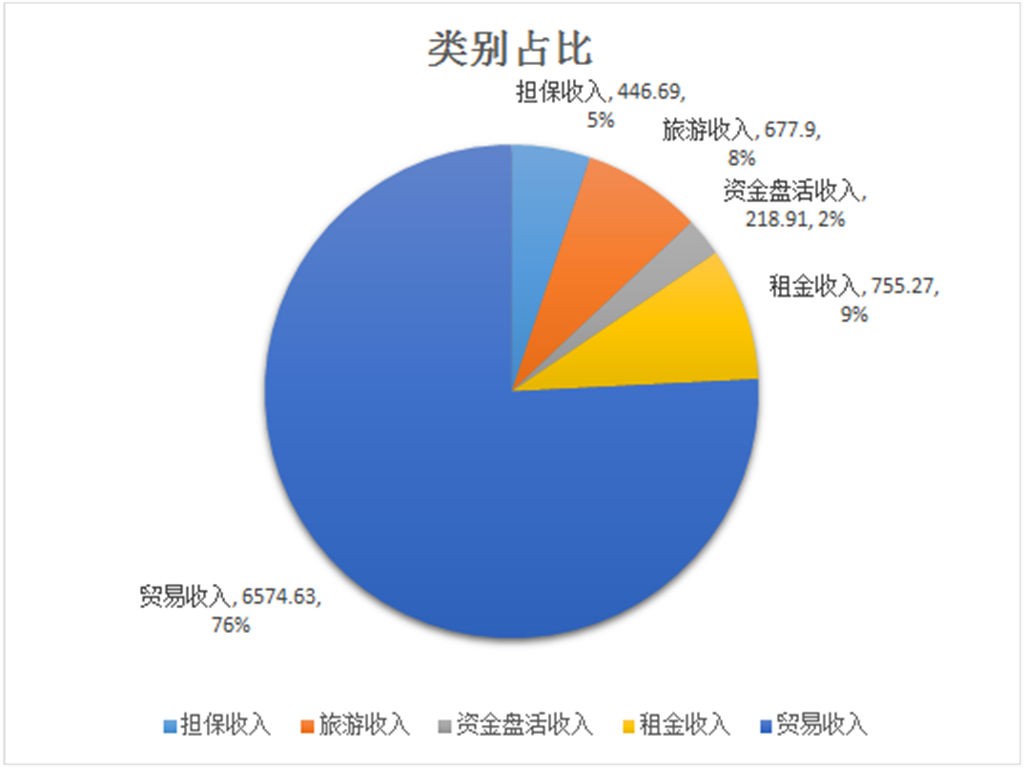1-10月,集團(tuán)公司經(jīng)營(yíng)收入為8673.4萬(wàn)元,同比去年增長(zhǎng)337 %。其中:貿(mào)易收入6574.63萬(wàn)元,占比76%;擔(dān)保業(yè)務(wù)收入446.69萬(wàn)元,占比5%;資金盤活收入218.91萬(wàn)元,占比2%;八寨溝旅游收入677.9萬(wàn)元,占比8%;租賃收入755.27萬(wàn)元,占比9%。