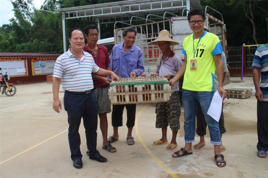 (圖為集團公司副總經理楊新棟為貧困戶發(fā)放雞苗)