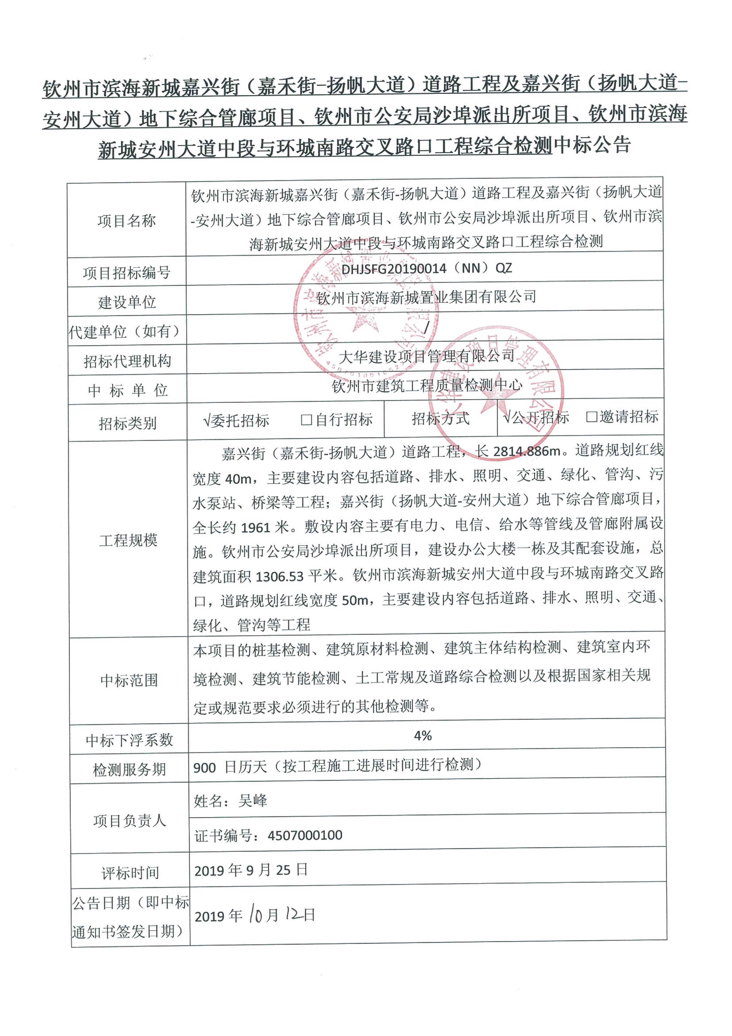 欽州市濱海新城嘉興街(嘉禾街-揚(yáng)帆大道)道路工程及嘉興街(揚(yáng)帆大道-安州大道)地下綜合管廊項(xiàng)目、欽州市公安局沙埠派出所項(xiàng)目、欽州市濱海新城安州大道中段與環(huán)城南路交叉路口工程綜合檢測(cè)中標(biāo)公告
