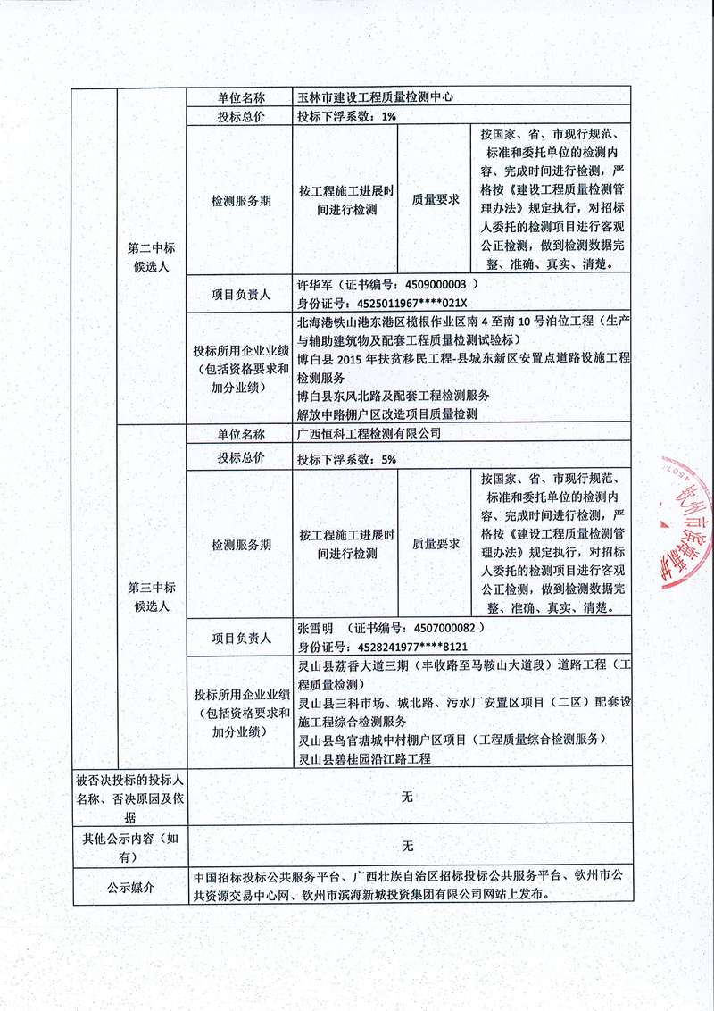 欽州市濱海新城茶山江大街項(xiàng)目、安州大道(珊瑚街至嘉興街段)強(qiáng)弱電綜合管溝及平山東大街(濱江東路-揚(yáng)帆大道)強(qiáng)弱電綜合管溝項(xiàng)目綜合檢測中標(biāo)候選人公示