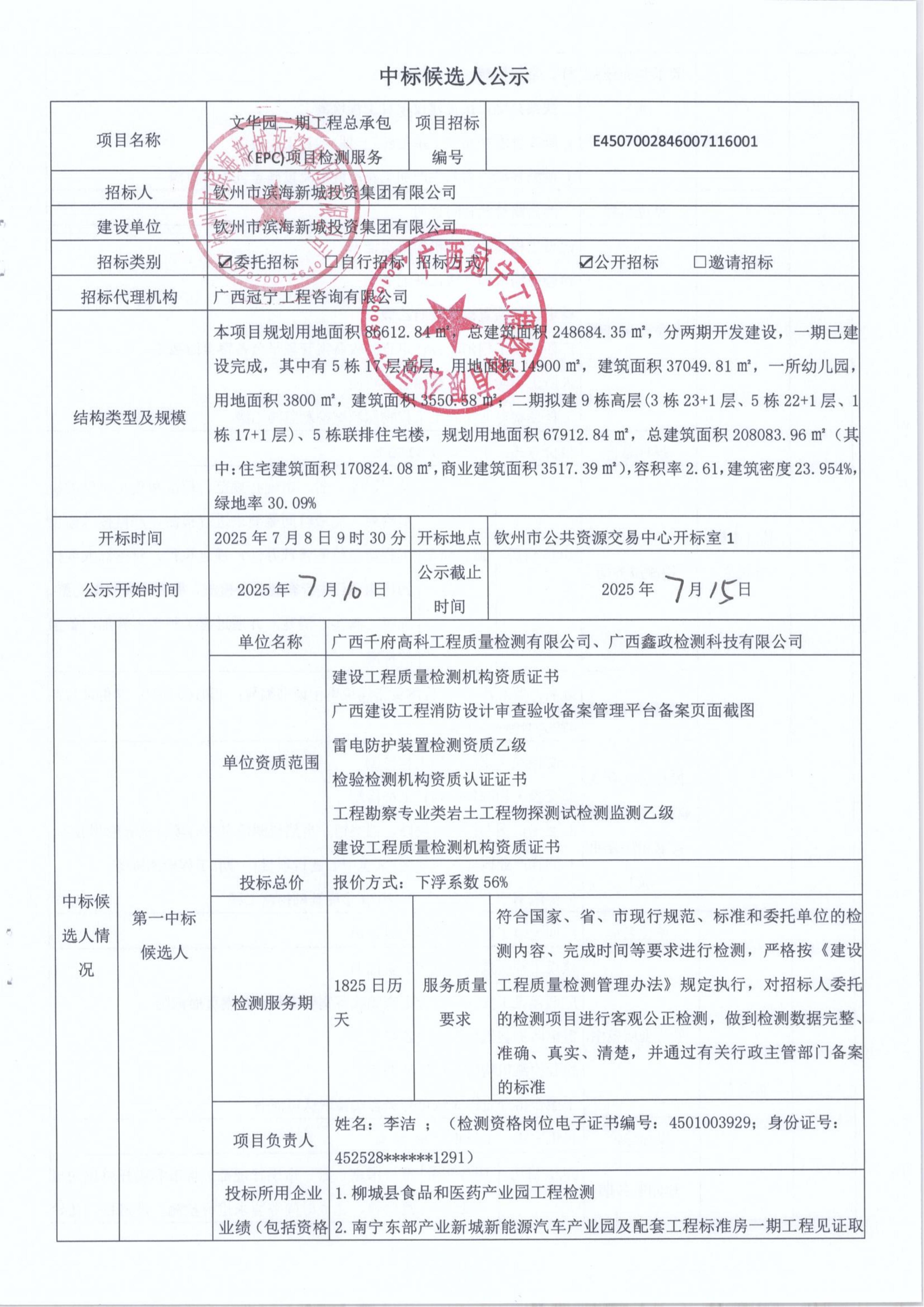 文華園二期工程總承包(EPC)項(xiàng)目檢測(cè)服務(wù)工程檢測(cè)招標(biāo)中標(biāo)候選人公示