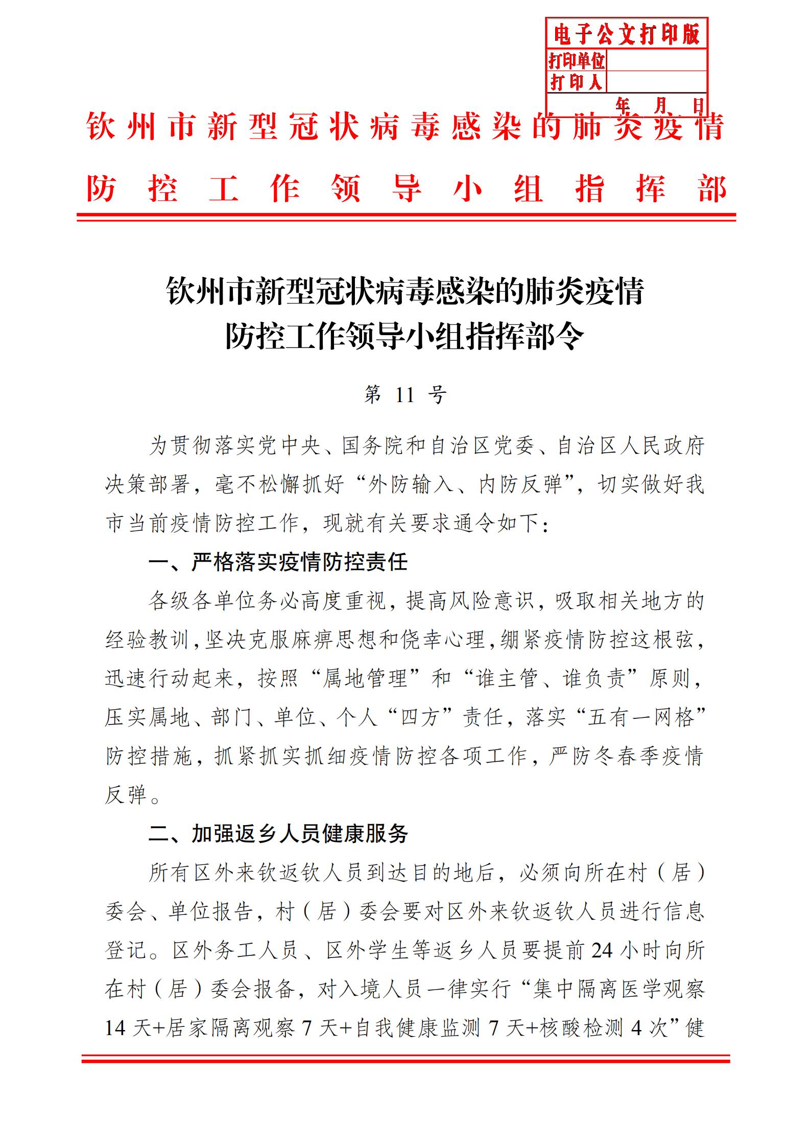 欽州市新型冠狀病毒感染的肺炎疫情防控工作領(lǐng)導(dǎo)小組指揮部令(第11號)