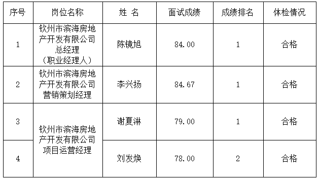 根據(jù)集團(tuán)公司2024年8月13日發(fā)布的《欽州市濱海新城投資集團(tuán)有限公司招聘公告》,經(jīng)報(bào)名、資格審查、面試、考察、體檢等程序,經(jīng)集團(tuán)公司黨委研究決定,現(xiàn)對(duì)欽州市濱海房地產(chǎn)開發(fā)有限公司總經(jīng)理(職業(yè)經(jīng)理人)、營銷策劃經(jīng)理及項(xiàng)目運(yùn)營經(jīng)理3個(gè)崗位擬聘用人選予以公示。